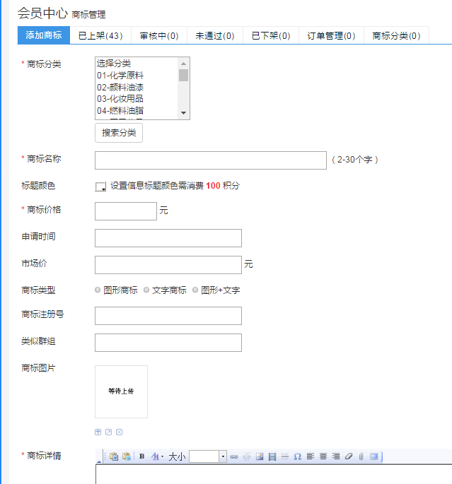 在此頁面可以根據(jù)自己實(shí)際情況,選擇要發(fā)布的商標(biāo)信息,包括:商標(biāo)類別、名稱、價(jià)格(包括出售價(jià)及市場(chǎng)價(jià),市場(chǎng)價(jià)僅供買家參考)、申請(qǐng)時(shí)間、類型、注冊(cè)號(hào)、類似群組、圖片上傳以及簡(jiǎn)要的文字說明,確認(rèn)無誤后即可點(diǎn)擊提交,待我們客服人員審核完畢后,即可在前臺(tái)出現(xiàn),成功上架。